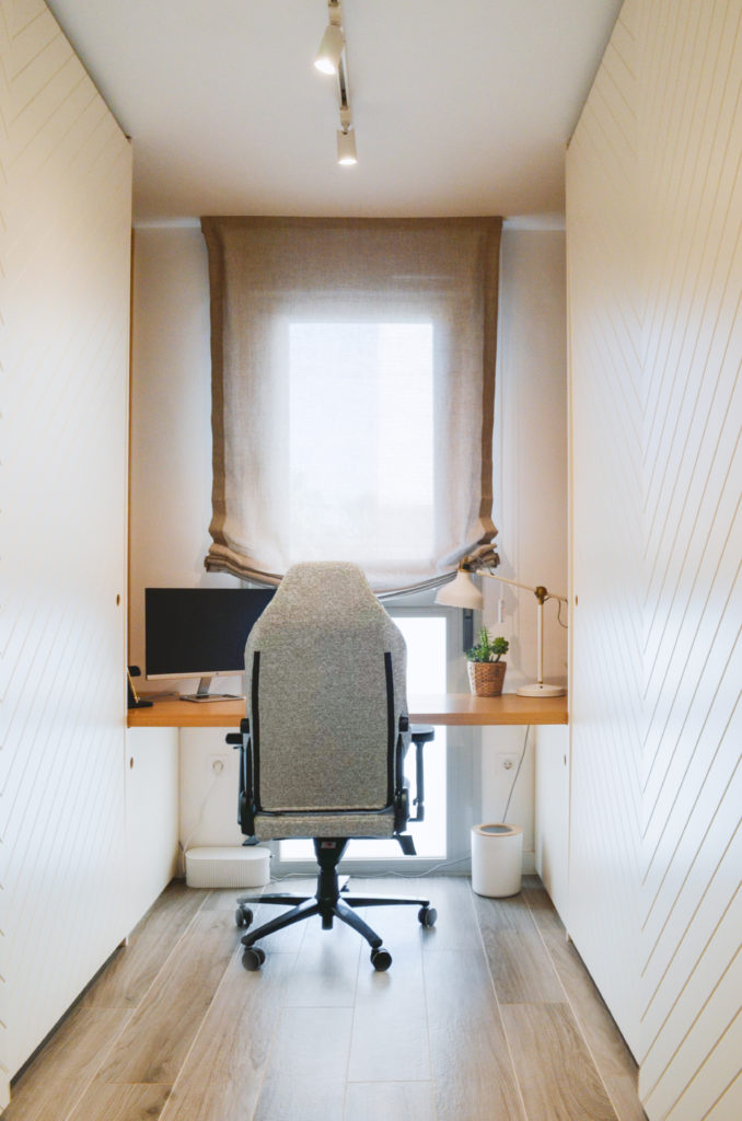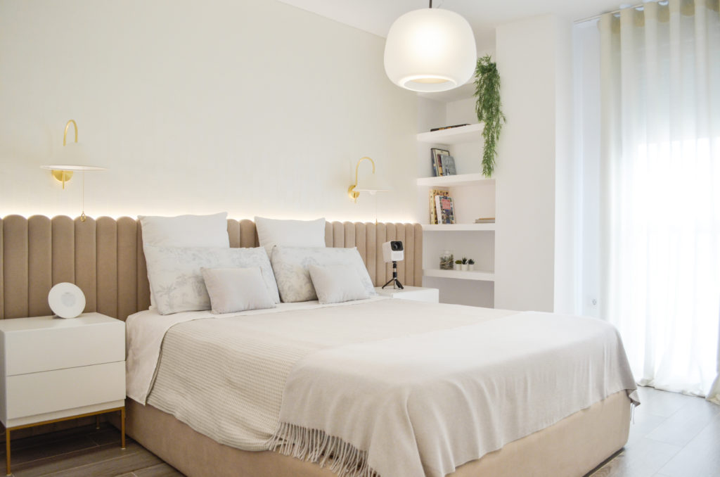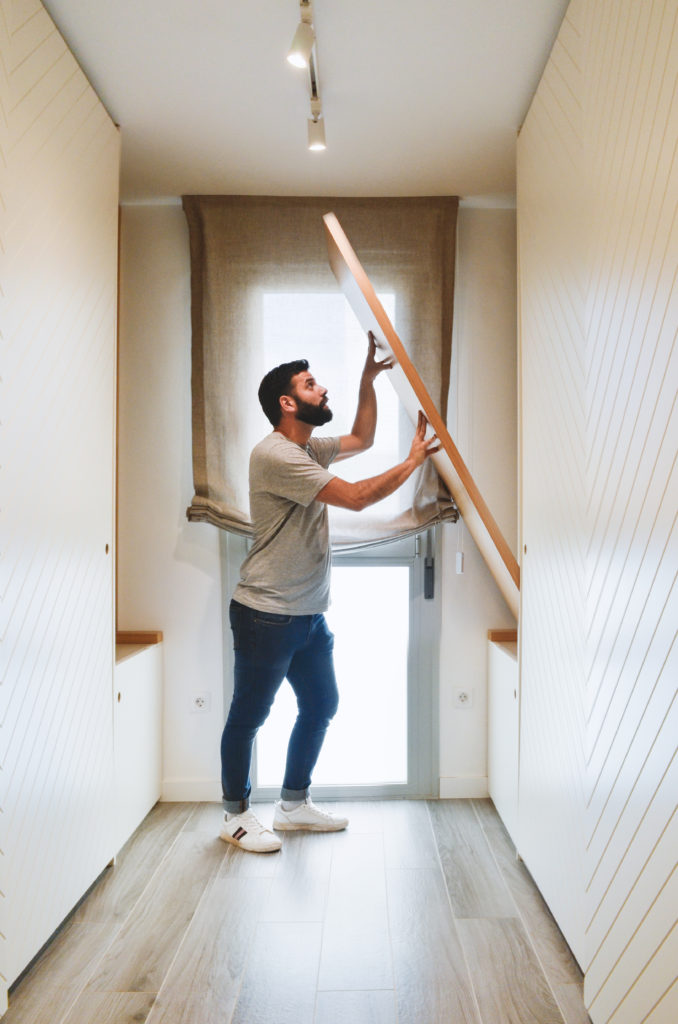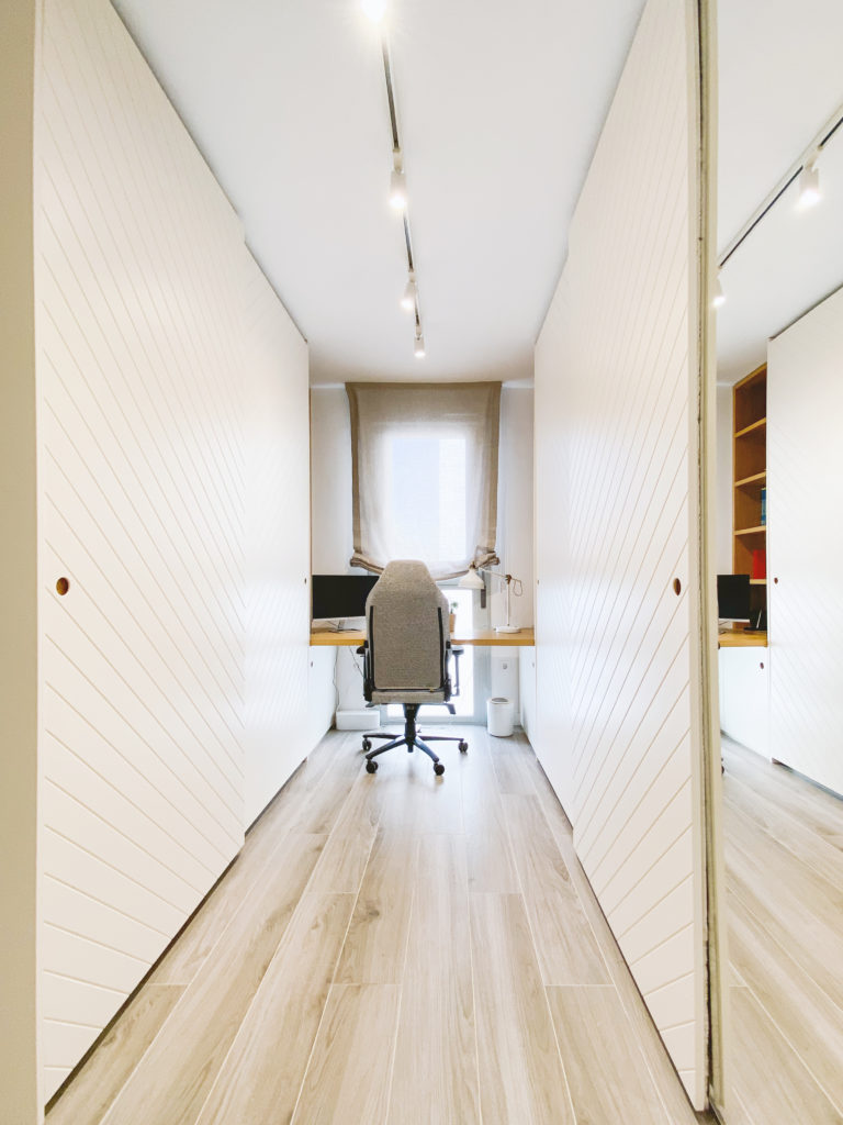 La utilización de elementos de corte clásico en el salón como las molduras con el uso de bañadores de pared modernos generan un discurso ecléctico que marcará los diferentes espacios de este proyecto. La reintrepretación del tocador clásico con iluminando el espacio de forma continua, el cabecero tapizado de extremo a extremo de la habitación colocado sobre un papel pintado de corte modernista o el vestidor – estudio de paredes canaladas son otros de los tantos ejemplos de dualidad estética de este maravilloso proyecto.
