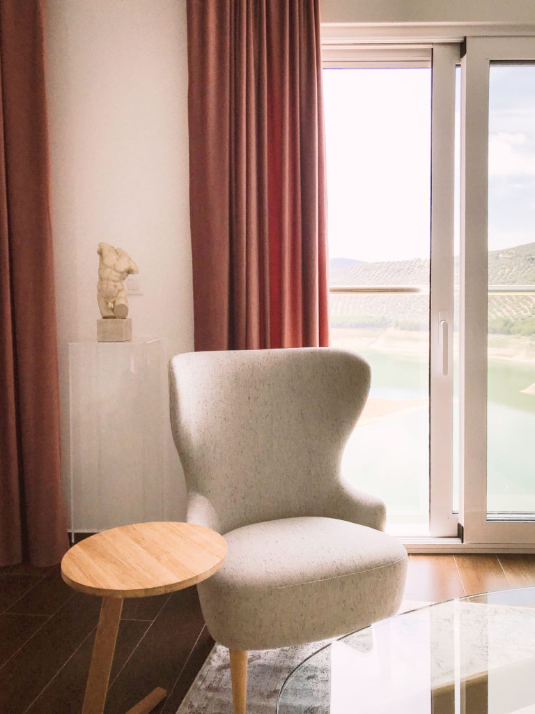 Tonos cálidos pero claros, que aportasen contraste con un suelo oscuro y que nos ayudasen a escenificar como en un gran teatro un conjunto que tendría como pieza artística principal las propias vistas del paisaje de Iznajar.
